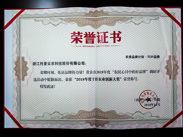12月7日,峰會現場還發布了以“樹立行業好品牌,服務中國新農業”為主題的2018年度“農民心目中的好品牌” ,來自全國各地的數十家企業摘獲殊榮,托普云農憑借多年來的技術創新與理念創新,榮獲“2018年度十家農業創新大獎”,與眾多企業代表一起站在了萬眾矚目的頒獎舞臺之上。