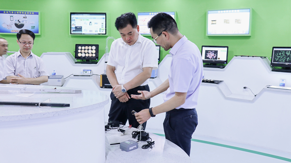 在托普云農(nóng)展廳內(nèi),唐冬壽副廳長一行聽取了陳渝陽董事長關(guān)于公司使命愿景、發(fā)展歷程、實踐案例等相關(guān)內(nèi)容的匯報。