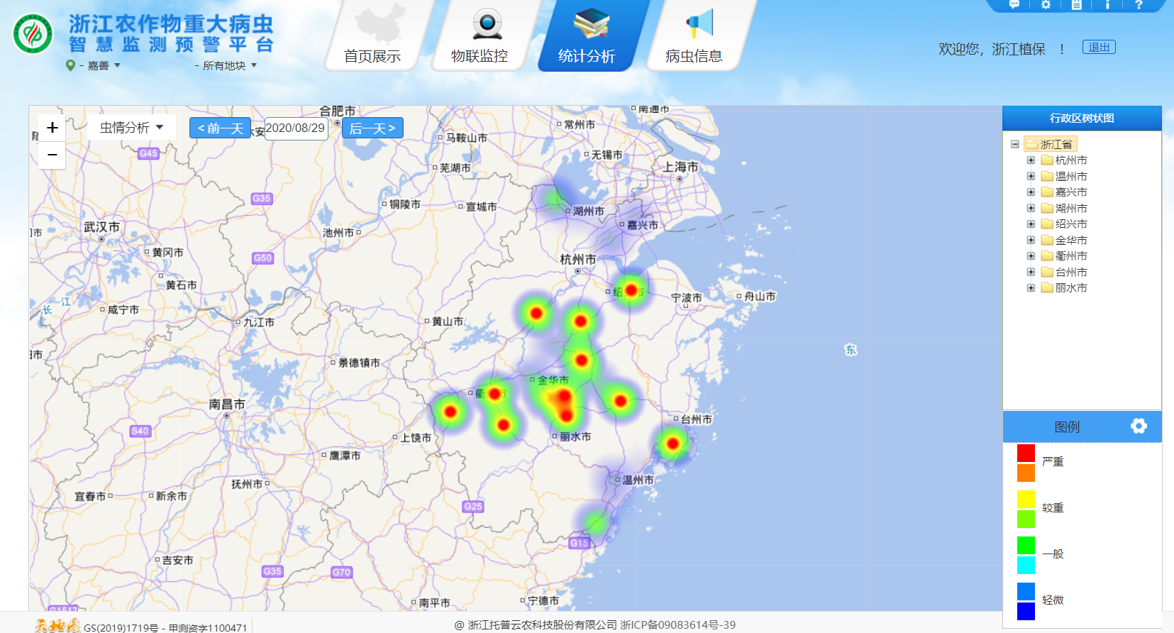 浙江農作物重大病蟲害智慧監測預警平臺蟲情區域分析圖