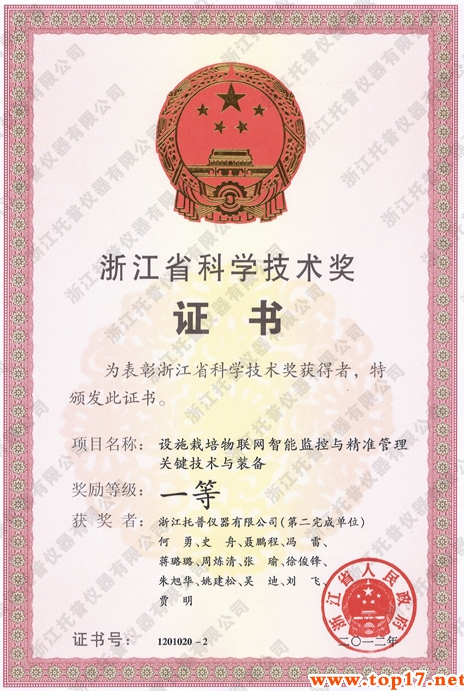 為了鼓勵科學技術(shù)創(chuàng)新,促進科學技術(shù)進步和社會經(jīng)濟發(fā)展,根據(jù)《浙江省科學技術(shù)獎勵辦法》,托普儀器的科研項目——《設(shè)施栽培物聯(lián)網(wǎng)智能監(jiān)控與精準管理關(guān)鍵技術(shù)與裝備》,經(jīng)過省科學技術(shù)評審委員會審定,被評為2012年度浙江省科學技術(shù)獎一等獎。