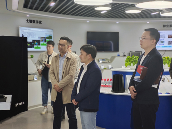 在托普云農數字三農展廳中,陳渝陽董事長向張常委一行詳細介紹了托普云農在數字三農建設中的應用成效,以智能裝備、大數據應用、互動體驗等多維度、多方式展現了數字農業新技術在智慧鄉村建設中的落地應用。