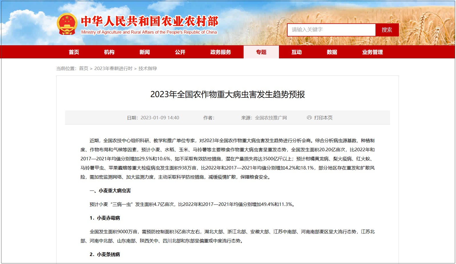 6月以來,東亞季風一路北上,逐漸靠近華北平原、東北平原。伴隨著季風,東南亞國家的一些重要病蟲害,包括我國南方的病蟲害,也在不斷北上。全國農(nóng)業(yè)技術推廣服務中心發(fā)布的《2023年全國農(nóng)作物重大病蟲害發(fā)生趨勢預報》顯示,預計小麥、水稻、玉米、馬鈴薯等主要糧食作物重大病蟲害呈重發(fā)態(tài)勢,全國發(fā)生面積20.20億畝次,比2022年和2017—2021年均值分別增加29.5%和10.6%。