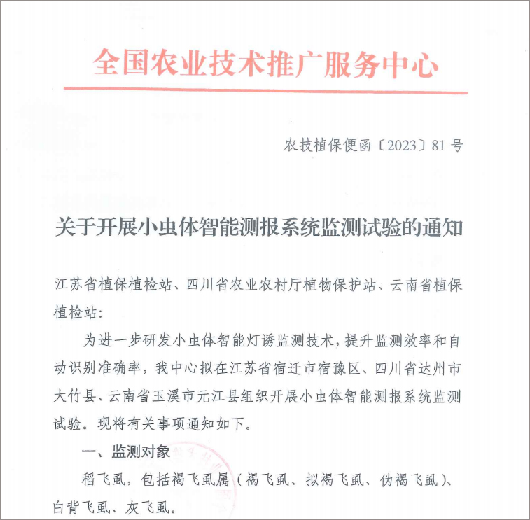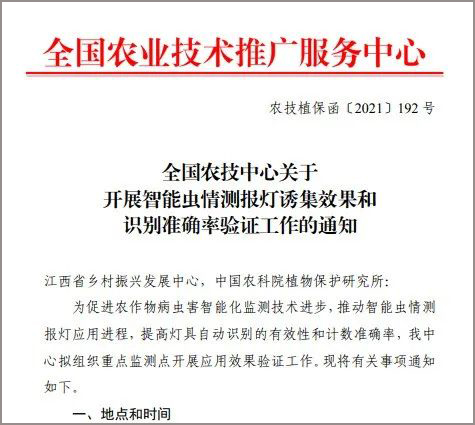 全國農(nóng)技中心關于開展智能蟲情測報燈誘集效果和識別準確率驗證工作的通知
