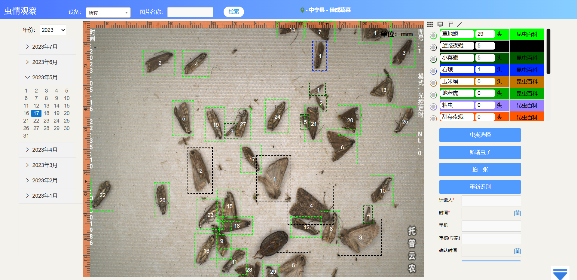 寧夏靠近黃河上游,是西北地區(qū)重要的糧食產(chǎn)區(qū)。去年5月,在中寧縣、賀蘭縣、靈武市、平羅縣四地,托普云農(nóng)農(nóng)作物病蟲疫情智能監(jiān)測點分別監(jiān)測到草地螟、小菜蛾高峰,平臺發(fā)送短信預警,寧夏農(nóng)技推廣總站迅速做出部署,發(fā)布防范措施。2023年5月,中寧縣佳成蔬菜監(jiān)測點單日誘蛾1093頭,再次達到誘蛾高峰,且蛾峰高于2022年同期,寧夏農(nóng)技推廣總站及時開展燈下和田間蛾量調(diào)查,避免出現(xiàn)大面積危害。