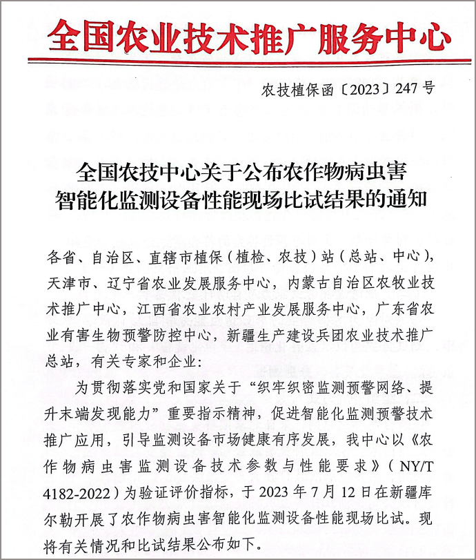為促進智能化監(jiān)測預警技術推廣應用,引導監(jiān)測設備市場健康有序發(fā)展,全國農(nóng)業(yè)技術推廣服務中心以《農(nóng)作物病蟲害監(jiān)測設備技術參數(shù)與性能要求》(農(nóng)業(yè)行業(yè)標準NY/T 4182-2022)為驗證評價指標,開展了智能化監(jiān)測設備現(xiàn)場展示和比試,托普云農(nóng)的智能蟲情測報燈圖像自動識別綜合準確率高達97.5%,優(yōu)勢凸顯。