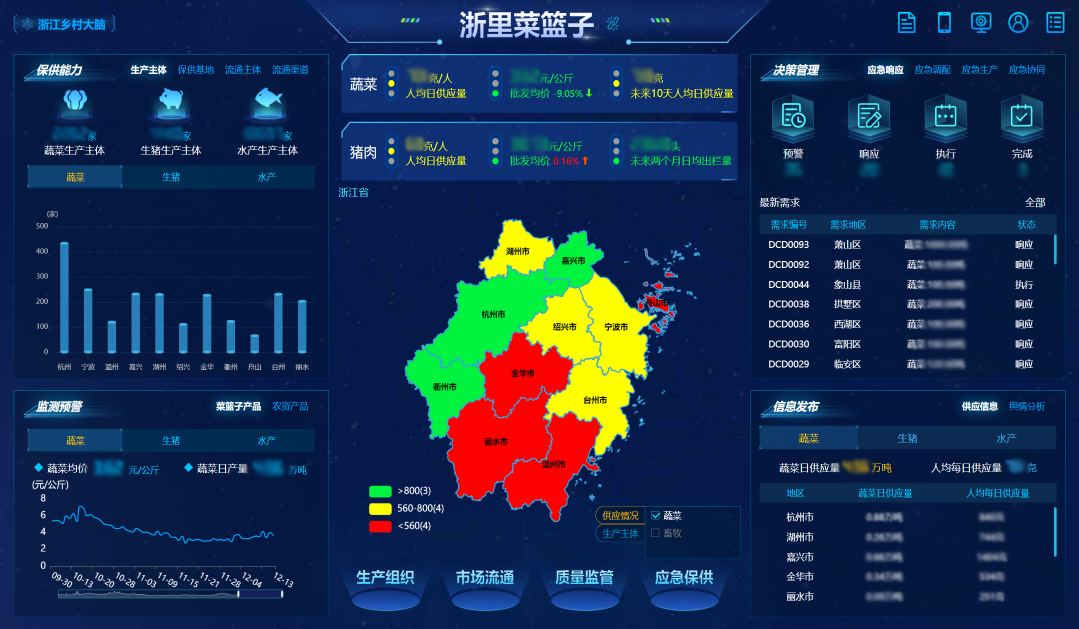 在產(chǎn)業(yè)賦能環(huán)節(jié),托普云農(nóng)打造智慧應(yīng)用——浙里菜籃子,有效保障浙江各地區(qū)“菜籃子”保供。作為首個(gè)菜籃子保供數(shù)字化平臺(tái),“浙里菜籃子”構(gòu)建了“平時(shí)+戰(zhàn)時(shí)”“常態(tài)+應(yīng)急”“政府+市場(chǎng)”的保供機(jī)制。在“平時(shí)常態(tài)”下,圍繞生產(chǎn)和流通兩端主體,做好生產(chǎn)服務(wù)、政策支持、動(dòng)態(tài)監(jiān)測(cè)、質(zhì)量監(jiān)管和市場(chǎng)監(jiān)管,促進(jìn)產(chǎn)銷有機(jī)對(duì)接,形成生產(chǎn)保供、質(zhì)量監(jiān)管和市場(chǎng)保供三大能力。在“戰(zhàn)時(shí)應(yīng)急”下,快速掌握應(yīng)急需求,開展應(yīng)急調(diào)運(yùn),進(jìn)行應(yīng)急配送,同時(shí)發(fā)布權(quán)威信息,讓老百姓心里有數(shù),心中不慌。