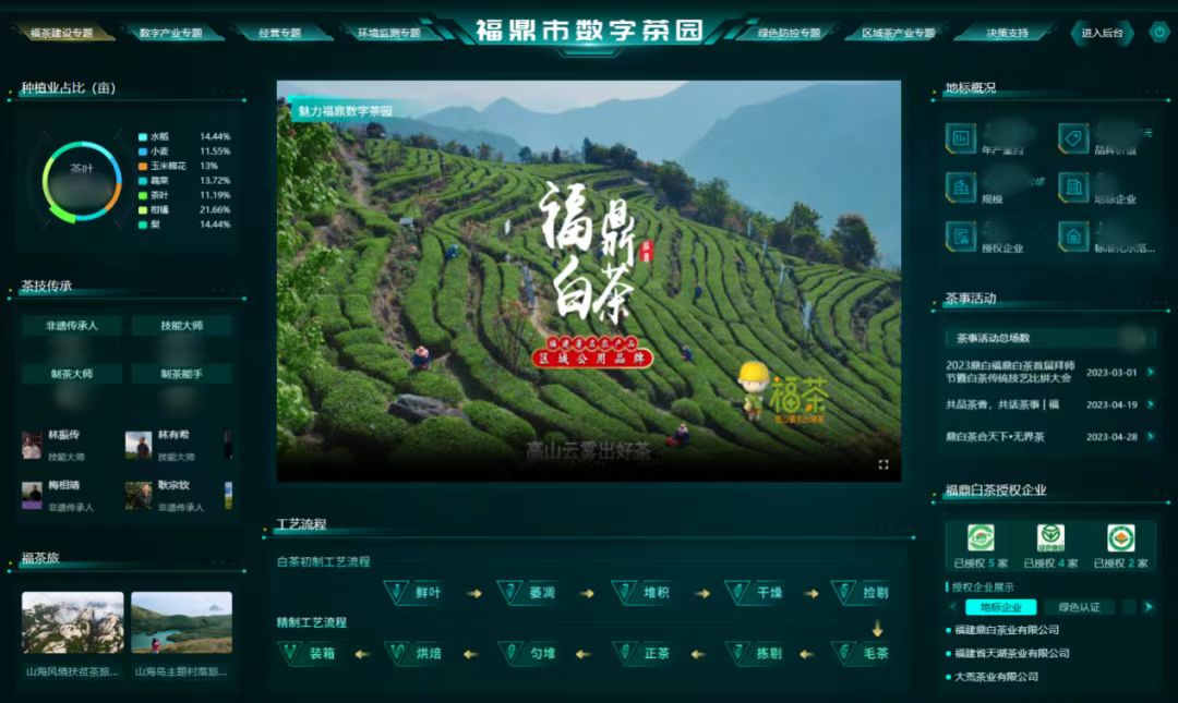 在福鼎,托普云農打造的數字茶園,基于福鼎茶葉全產業及企業生產、加工、銷售等環節的大數據平臺,實現人、地、物精細化管理,提供了茶葉生產預警、產銷分析、產量分析、品質分析、產業發展等服務,為福鼎茶葉生產經營管理提供科學的輔助決策。