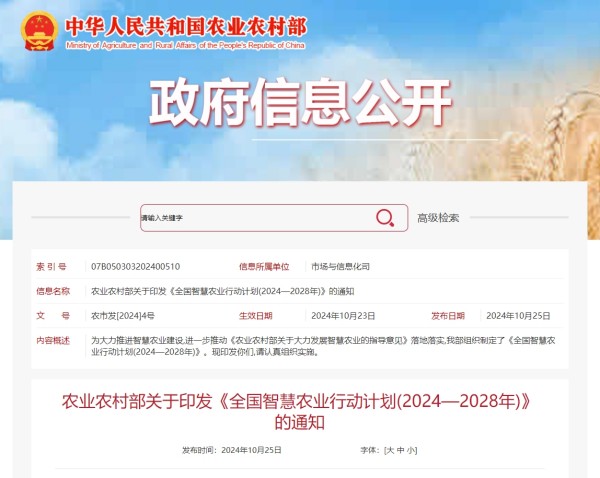 10月25日,農業農村部發布“關于大力發展智慧農業的指導意見”,指出:“智慧農業是發展現代農業的重要著力點,是建設農業強國的戰略制高點。大力發展智慧農業,助力推進鄉村全面振興、加快建設農業強國”,并印發《全國智慧農業行動計劃(2024—2028年)》,進一步為數智技術在農業領域的應用和推廣提供了堅實的政策保障。