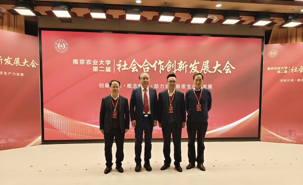南京農(nóng)業(yè)大學(xué)黨委常委、副校長丁艷鋒(左二),前沿交叉研究院院長竇道龍(右一),托普云農(nóng)董事長陳渝陽(右二),智慧農(nóng)業(yè)研究院院長朱旭華(左一)合影
