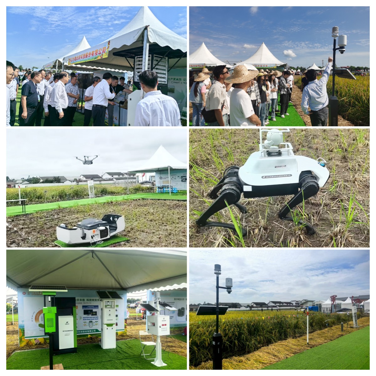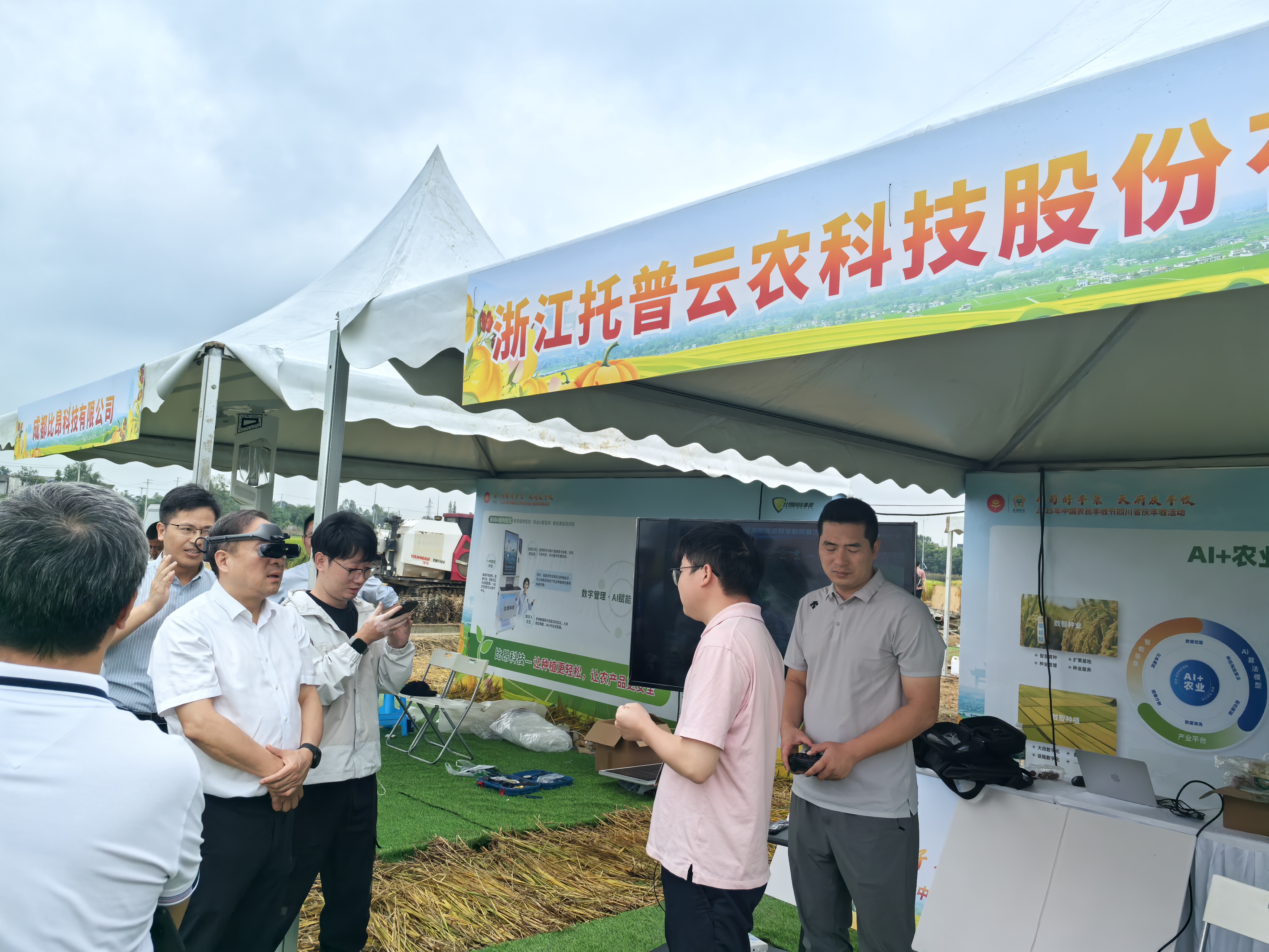 在智慧農(nóng)業(yè)示范體驗區(qū),托普云農(nóng)自主研發(fā)打造的AI智能體「問稷」,以及AI+無人機(jī)、AR智能眼鏡、田間機(jī)器人(狗)等一系列數(shù)智化“新農(nóng)具”整齊陳列,工作人員正現(xiàn)場演示設(shè)備操作流程,吸引了眾多嘉賓駐足觀看。其中,幾位前來考察的領(lǐng)導(dǎo)對造型輕便的 AR 眼鏡格外感興趣,主動詢問功能并試戴體驗。據(jù)介紹,AR 眼鏡能讓農(nóng)技人員實時獲取作物生長狀態(tài)、病蟲害情況;田間機(jī)器人(狗)可快速采集傳輸?shù)孛姝h(huán)境數(shù)據(jù);結(jié)合「問稷」AI 智能體,能為田間生產(chǎn)管理提供精準(zhǔn)農(nóng)事操作建議。