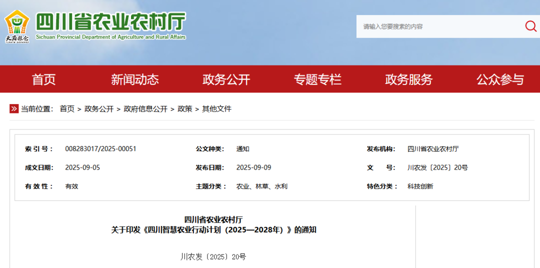 近年來,四川省錨定 “打造新時代更高水平‘天府糧倉’” 目標(biāo),持續(xù)推進(jìn)糧食穩(wěn)面增產(chǎn),深化 “天府糧倉?百縣千片” 建設(shè)。為進(jìn)一步為“天府糧倉”注入數(shù)智動能,四川省農(nóng)業(yè)農(nóng)村廳近日印發(fā)《四川智慧農(nóng)業(yè)行動計劃(2025—2028 年)》(以下簡稱《計劃》),提出到“瞄準(zhǔn)打造新時代更高水平“天府糧倉”,以推進(jìn)物聯(lián)網(wǎng)、衛(wèi)星遙感、人工智能、大數(shù)據(jù)等現(xiàn)代信息技術(shù)在農(nóng)業(yè)農(nóng)村領(lǐng)域全方位全鏈條普及應(yīng)用為主線,加快推進(jìn)四川農(nóng)業(yè)農(nóng)村現(xiàn)代化”,為四川智慧農(nóng)業(yè)發(fā)展畫出清晰 “路線圖”。