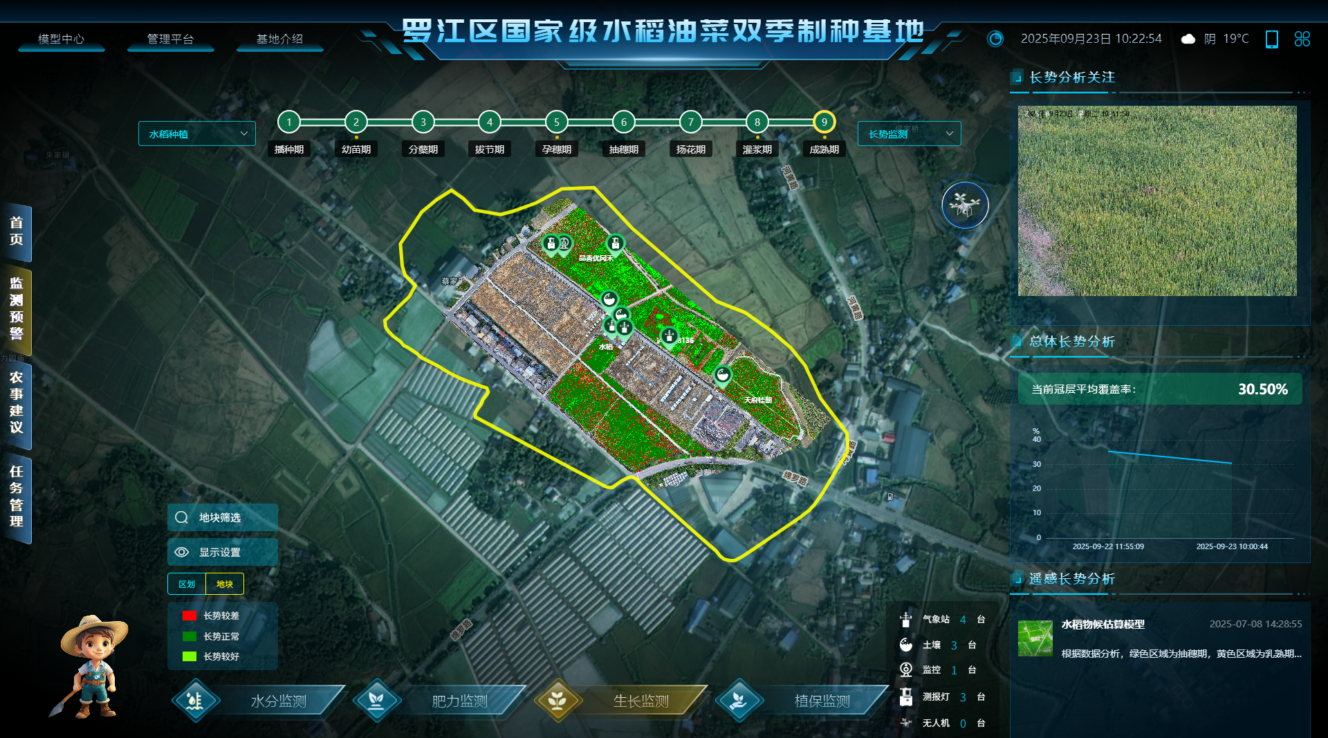 以水稻生長周期為主線,結(jié)合托普自主研發(fā)的水稻生育期預(yù)測、變量灌排、變量施肥、變量施藥等模型算法,摸清作物的生長規(guī)律,為大田精細(xì)化管理提供決策支撐。