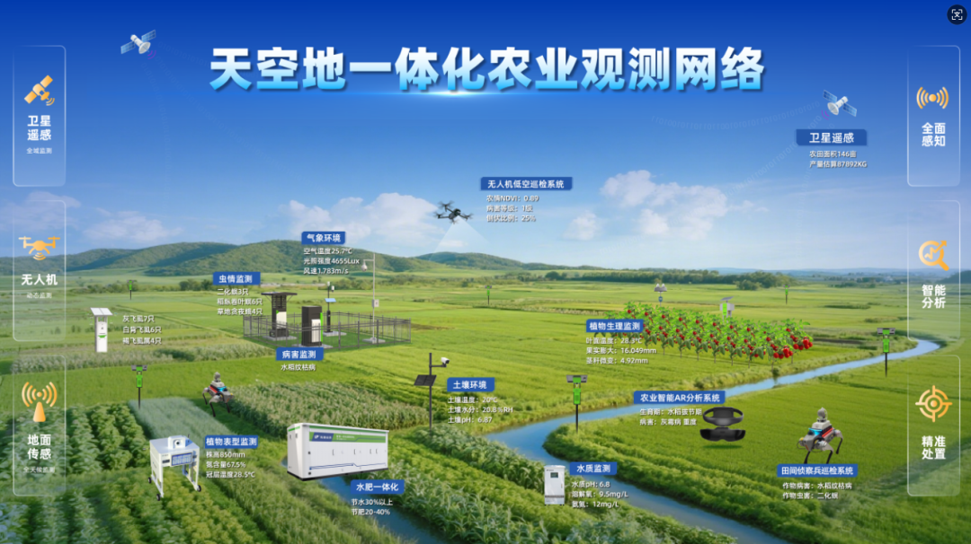 通過融合衛(wèi)星遙感、無人機(jī)低空遙感、智能機(jī)器人(狗)、農(nóng)情監(jiān)測站、高精度農(nóng)業(yè)傳感器等智能裝備,構(gòu)建“空天地”全方位監(jiān)測體系,全面實時高效采集農(nóng)田環(huán)境、水分、肥力、病蟲害、作物生長等信息。